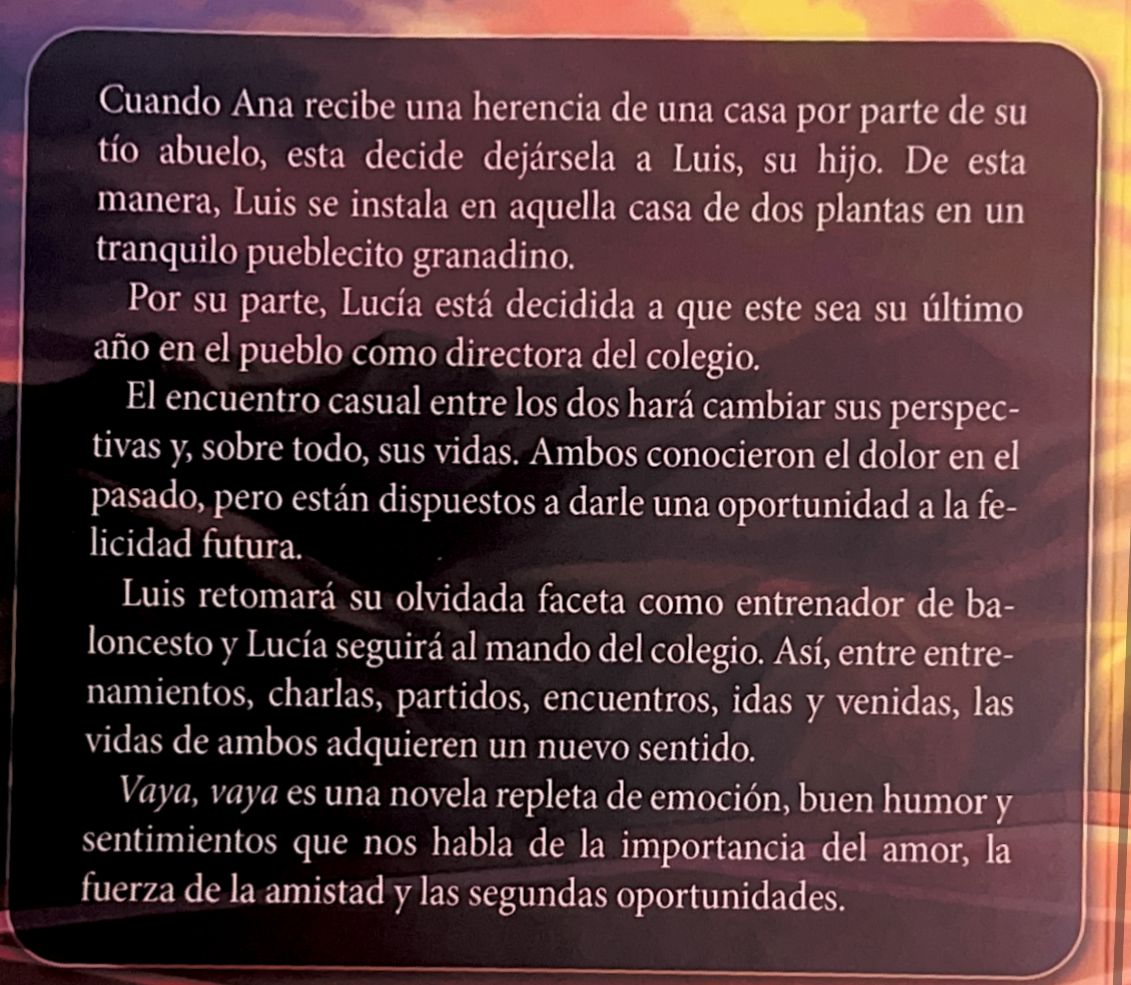 Vaya, Vaya es una novela que combina amor, humor y superación personal, ambientada en un pequeño pueblo lleno de encanto y personajes inolvidables. La historia sigue a un hombre que, tras heredar una vieja casa familiar, se embarca en un viaje de redescubrimiento personal. Entre reformas y encuentros inesperados, surge una conexión especial con Lucía, la directora del colegio local, que lucha entre su amor por la enseñanza y las decisiones que marcarán su futuro.